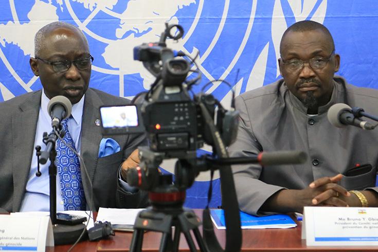 Lors d’une conférence de presse aux côtés de Maitre Bruno Gbiegba, président de ce Comité, Dieng a rappelé ses audiences avec le président Faustin Archange Touadéra, le premier ministre et les ministres de la Justice et de la Réconciliation, au cours desquelles il a rappelé la nécessité d’adopter le projet de loi portant création de la Commission Nationale des Droits de l’Homme et des Libertés Fondamentales. Les discussions ont également porté sur la création des mécanismes de justice transitionnelle notamment la Commission Vérité, Justice, Réparation et Réconciliation. Le Conseiller spécial a également rencontré des représentants de la société civile et des médias.